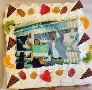 Natuurlijk werd het behalen van de koploperprijs op kantoor gevierd. Geheel in stijl met duurzame taart van letterlijk ‘de bakker op de hoek’. Dat smaakt naar meer!